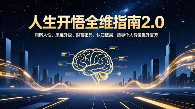 本课程为《开悟2.0升级版人生进阶指南》,是一套系统整合认知升级与人生实践的深度课程。课程围绕四大核心模块展开:“洞察人性”揭示阶层、权谋与关系本质;“财富密码”聚焦趋势判断、天赋发掘与普通人实现自由的路径;“思维升级”教授深度思考、高效学习与心流等认知重构方法;“自我圆满”则引导向内探索,融合经典智慧实现精神内守。课程旨在通过全维度认知破局与能力重塑,帮助学员在理解社会规律与内在自我的基础上,实现个人成长与价值跃迁。
